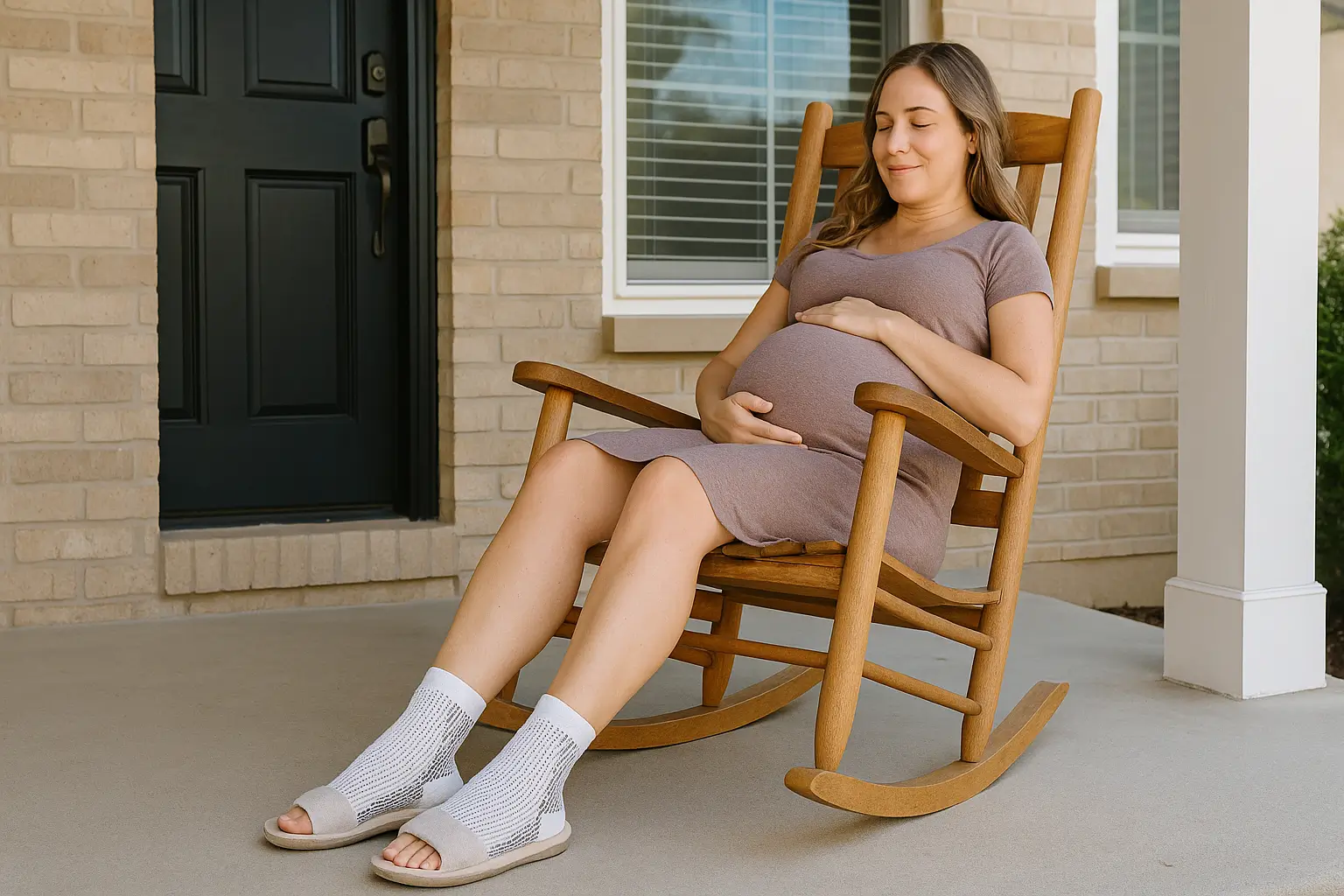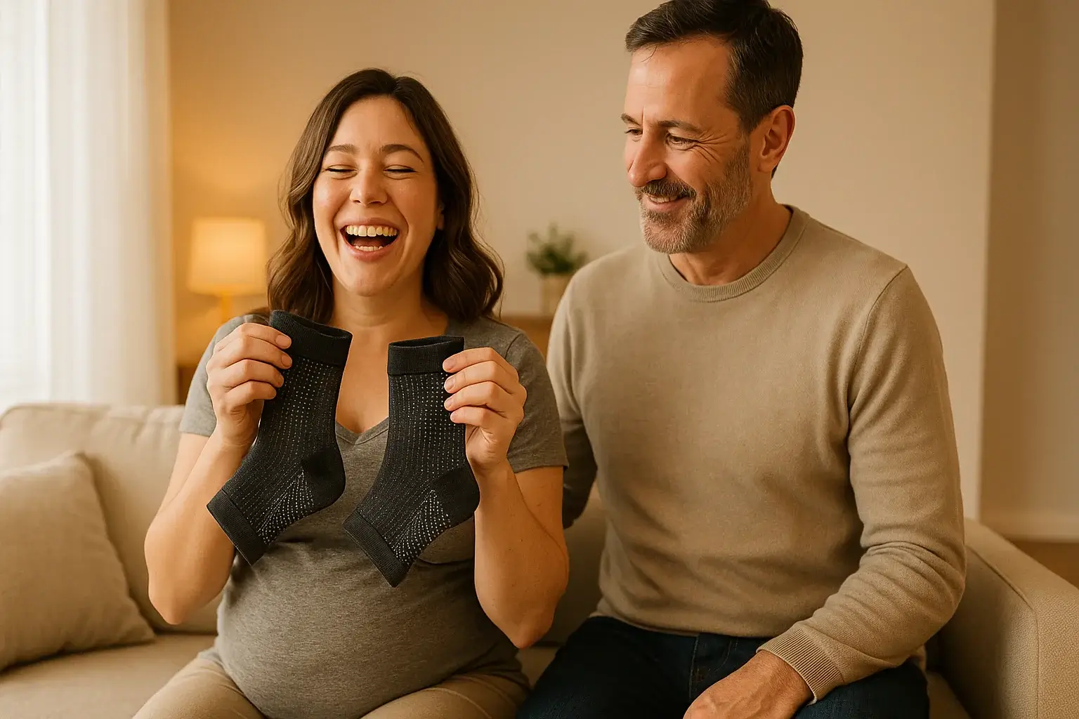 Eigentlich wollte ich die Socken zuerst gegen meine Plantarfasziitis testen – doch kaum lag das Päckchen auf dem Tisch, schnappte meine Frau sie sich. Wer könnte einer Schwangeren etwas abschlagen? Ihre Beine waren wirklich stark geschwollen, besonders um die Knöchel, also half ich ihr jeden Abend vor dem Schlafengehen, die Tieberg Kompressionssocken anzuziehen.
