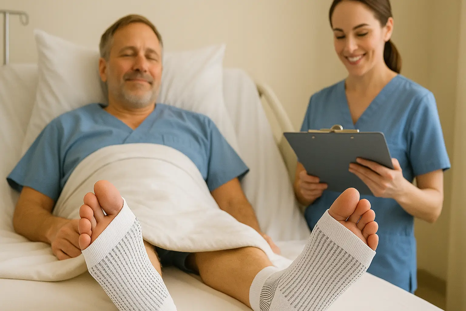 Das Risiko, dass sich schmerzhafte und gefährliche Blutgerinnsel in den Beinen bilden, steigt nach einer Operation drastisch an, und es steigt auch, wenn man bettlägerig ist.